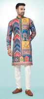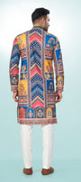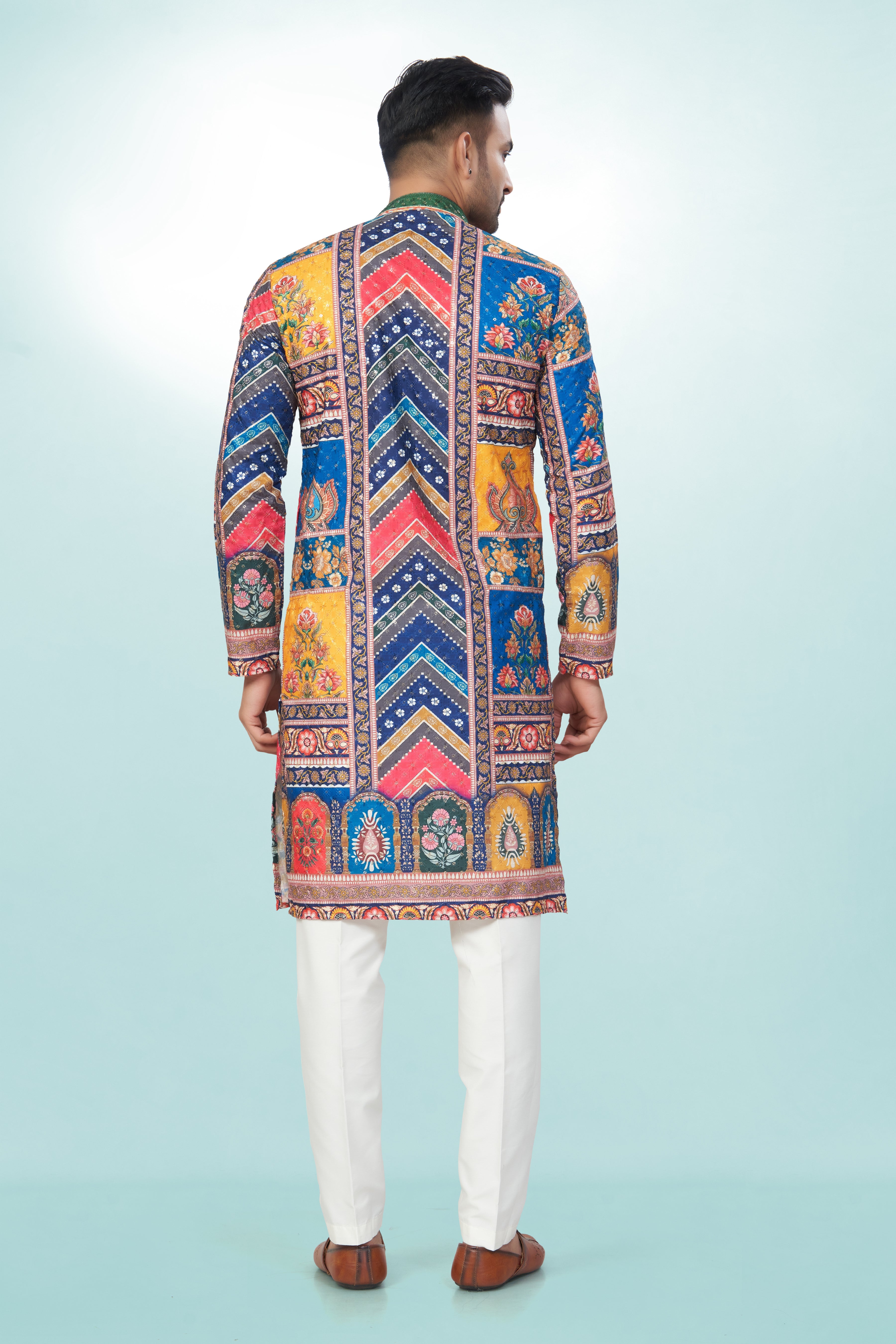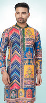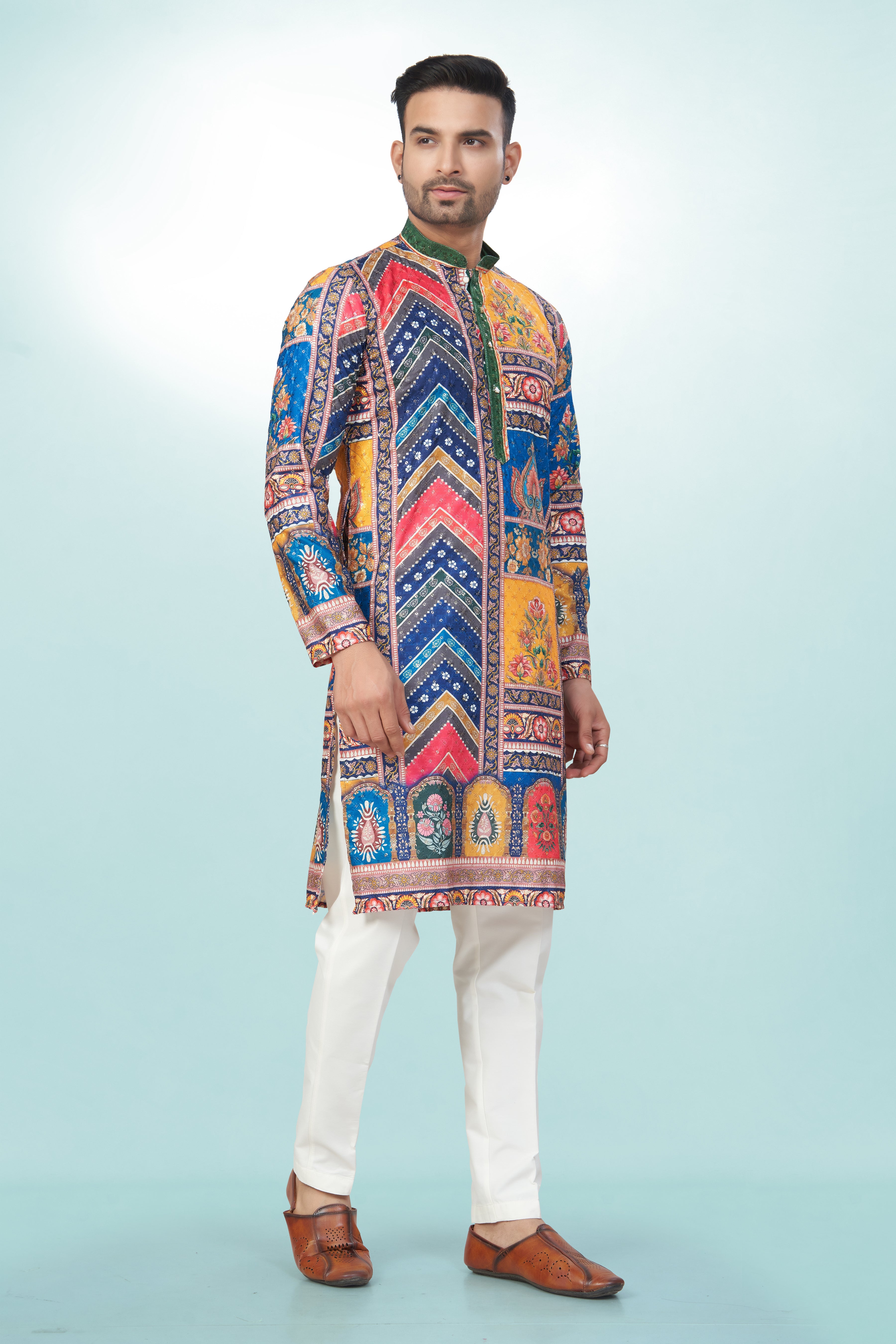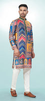 Step into the Spotlight with this Vibrant and comfortable Multi Colored Kurta, Fusing traditional style with a bold, contemporary Print. Perfect for festive daytime events and cultural gathering. Abstract Print appears to on a Cotton Blend Base for comfort with a digital print and subtle sequence/embroidery work on the collar Area, which is typical for this style.