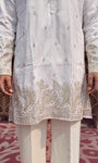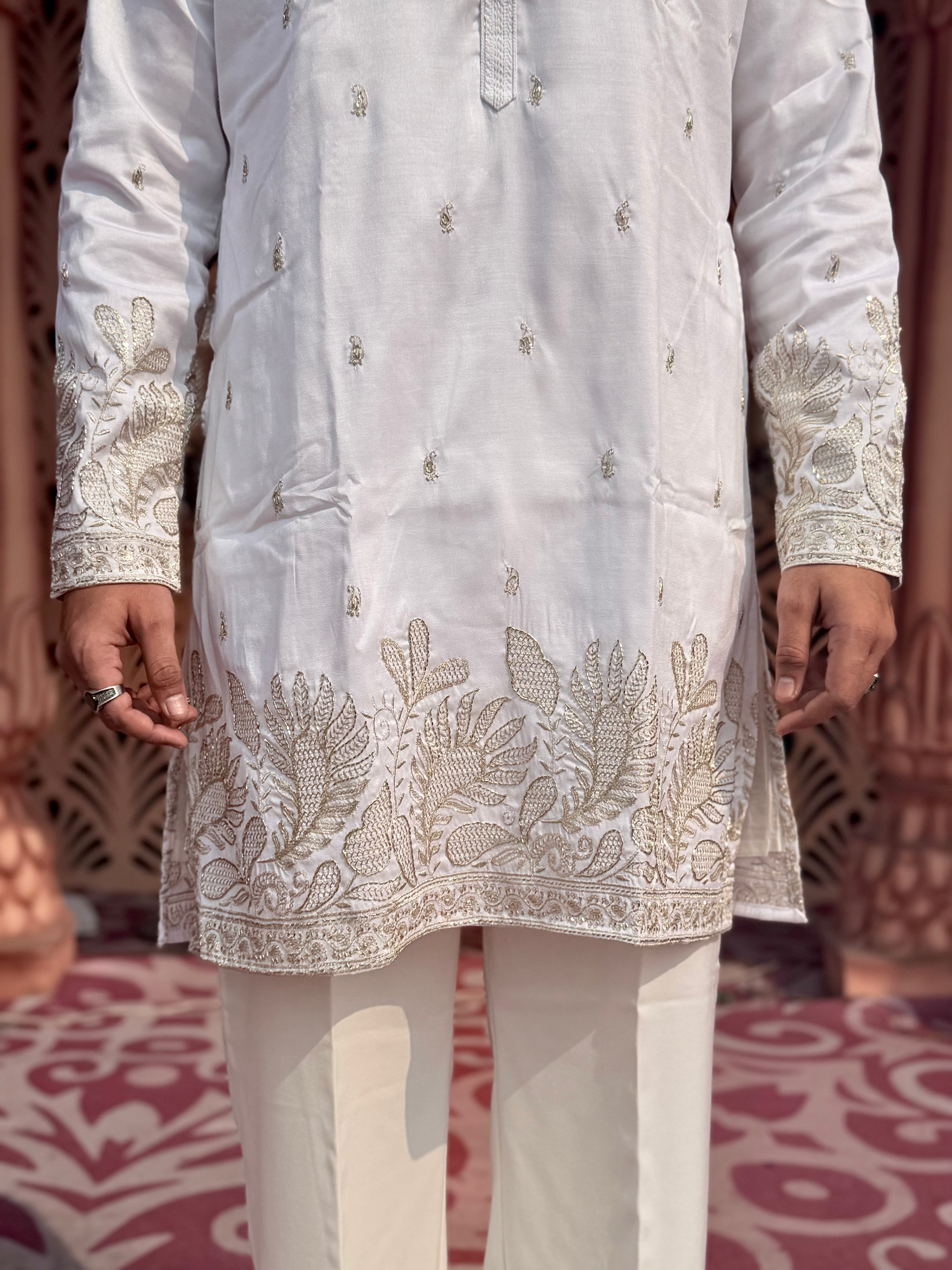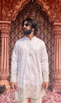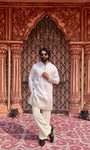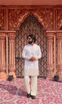 Tailored for the modern gentleman, this Ambush White mid-kurta is crafted from a breathable cotton-silk blend with a soft inner lining for lasting comfort. The subtle woven accents add refined character, making it effortlessly sophisticated without trying too hard.