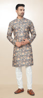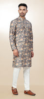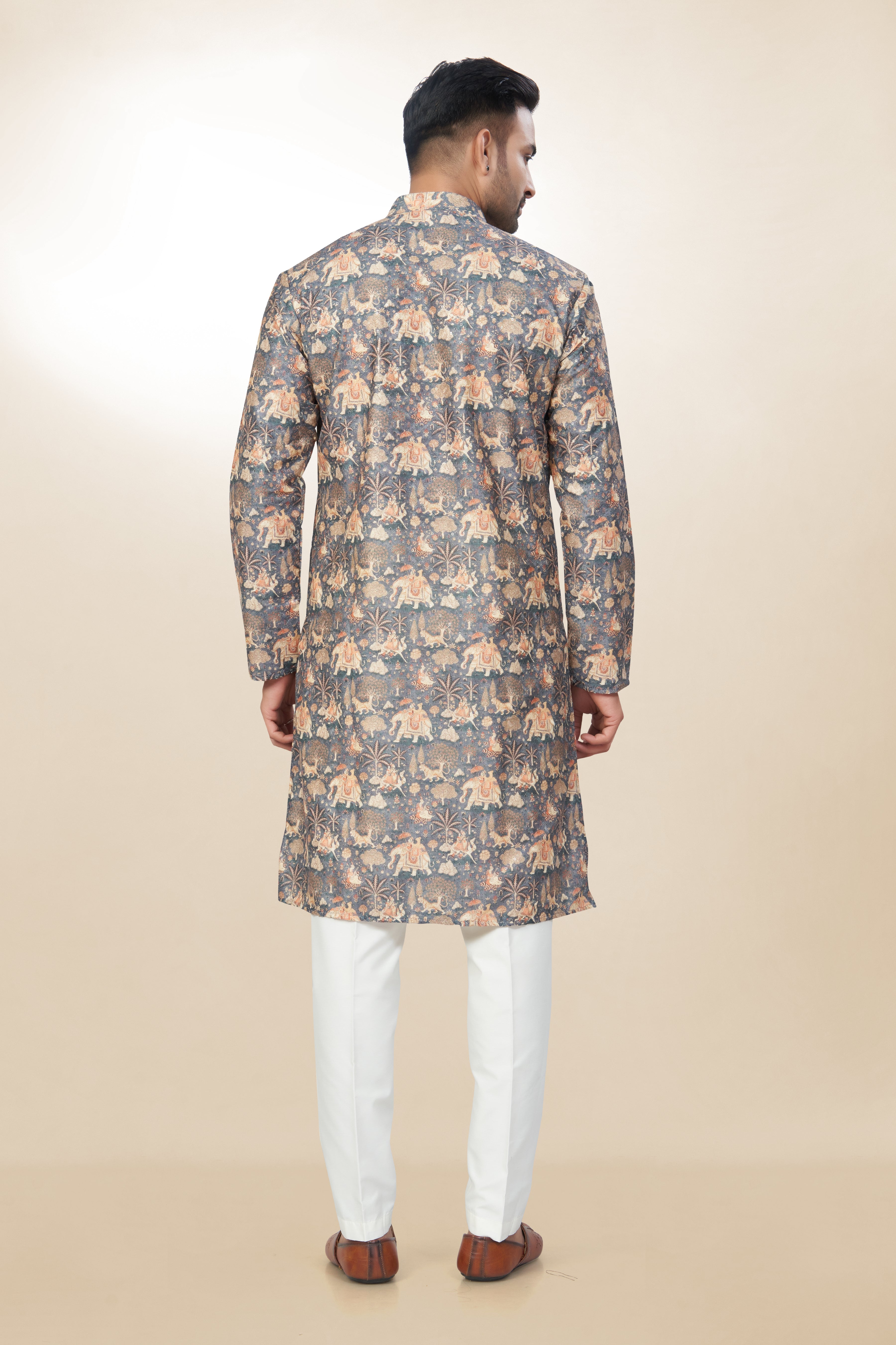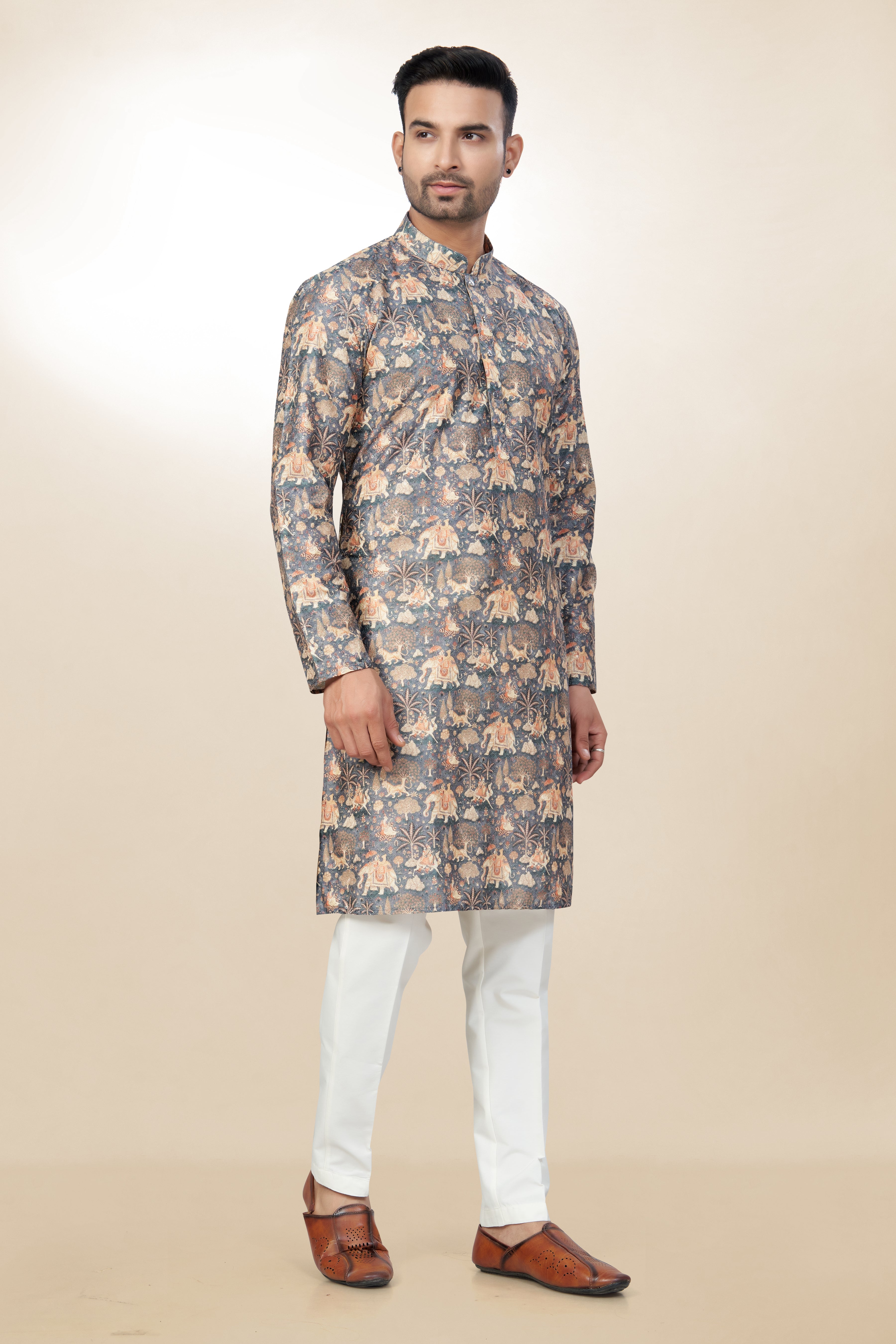 Step into the Spotlight with this Muted Slated Grey/Dusty Blue-grey. The entire kurta is covered in a dense, detailed pattern that resembles a traditional tapestry like – Stylized Elephant, ornate foliage & Architectural. Print is carefully executed, offering a beautiful visual texture that gives the feel of expensive weaving or embroidery work, while retaining the lightness of cotton.
