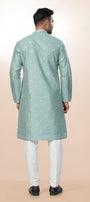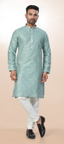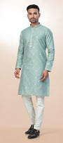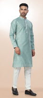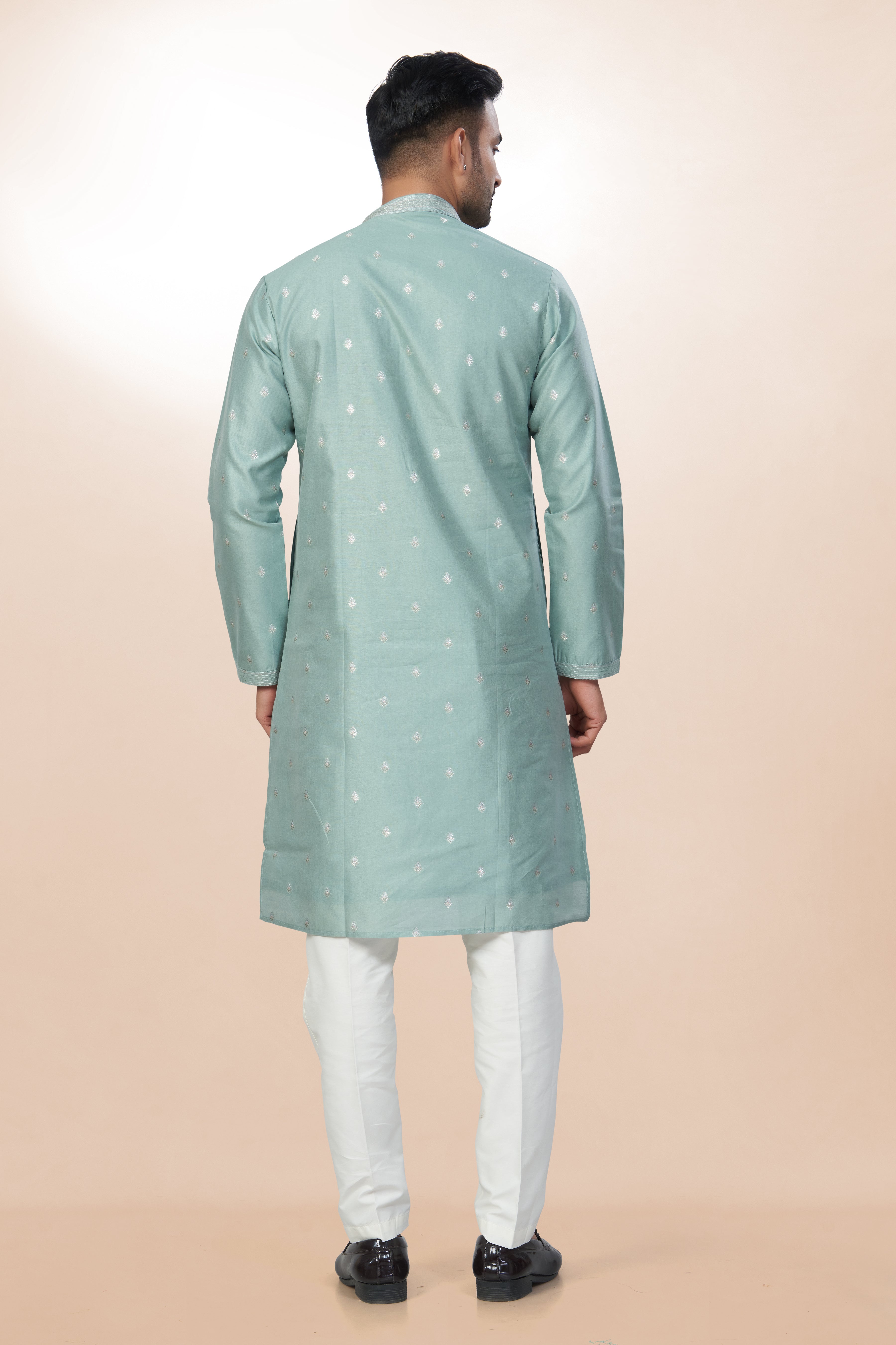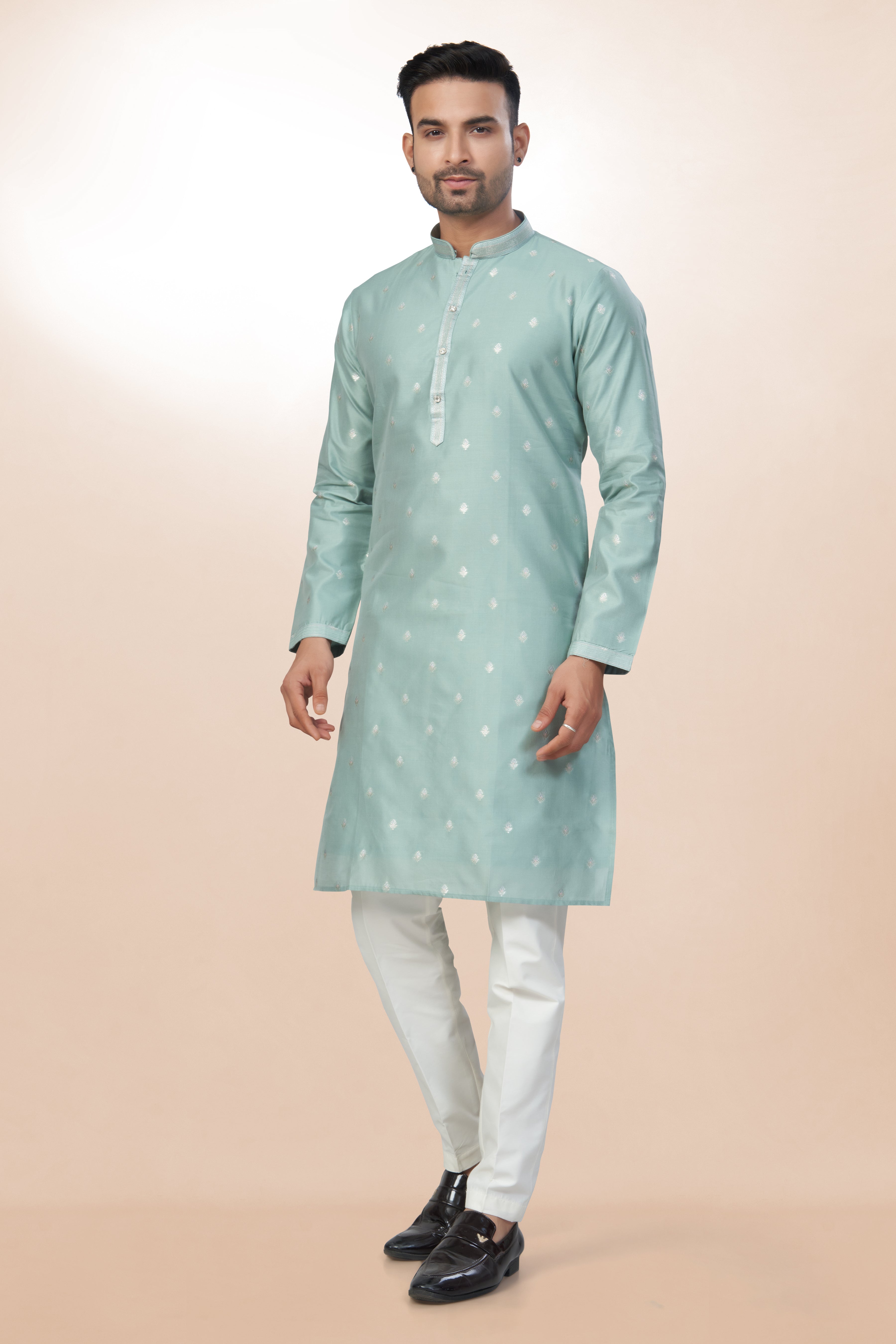 Step into the Spotlight with this Soothing Mint Green or Sage Green kurta, delicate Self-Woven motifs (Jaal Work) and Detailed Placket. Crafted from a premium silk blend fabric that drapes beautifully and has a rich, soft sheen for an elevated appearance. It is lightweight and comfortable for all-day wear.