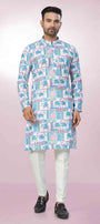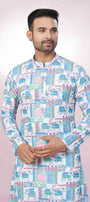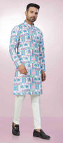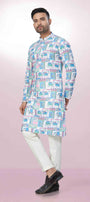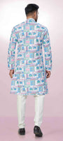 Elephant Printed Cotton Kurta For Men | Chickenkari Work - Sky Blue / S