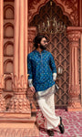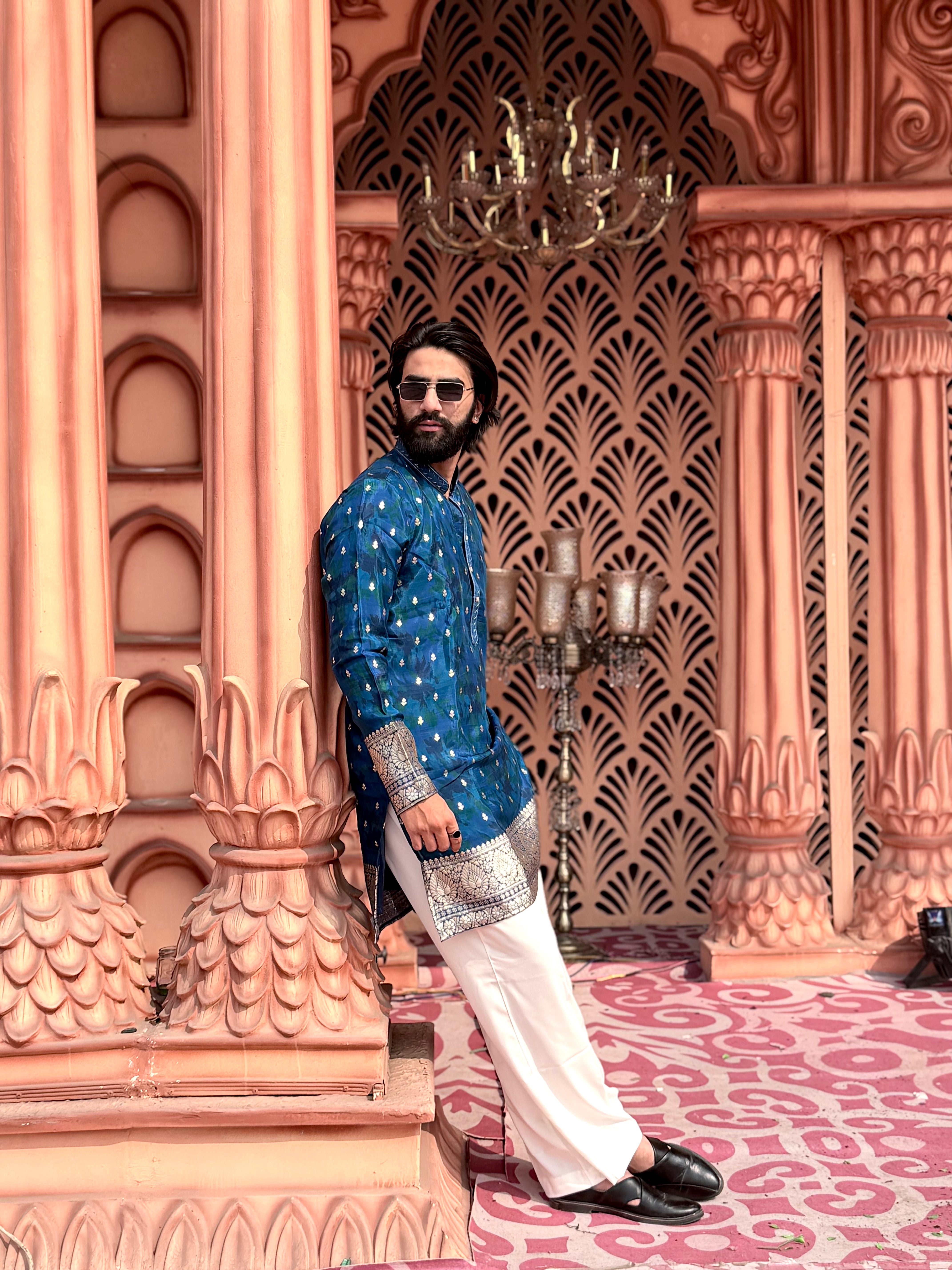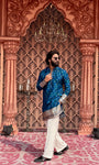 Tailored for the modern gentleman, this Imperial Blue mid-kurta is crafted from a breathable cotton-silk blend with a soft inner lining for lasting comfort. The subtle woven accents add refined character, making it effortlessly sophisticated without trying too hard.
