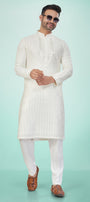 Elevate your festive look with the stunning simplicity of our Ivory Glaze mirror work kurta. The entire kurta id adorned with subtle, closely set shimmering sequins or mirror – work arranged in vertical stripes. This intricate work catches the light, creating a dynamic, sparkling effect as you move.