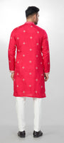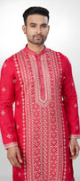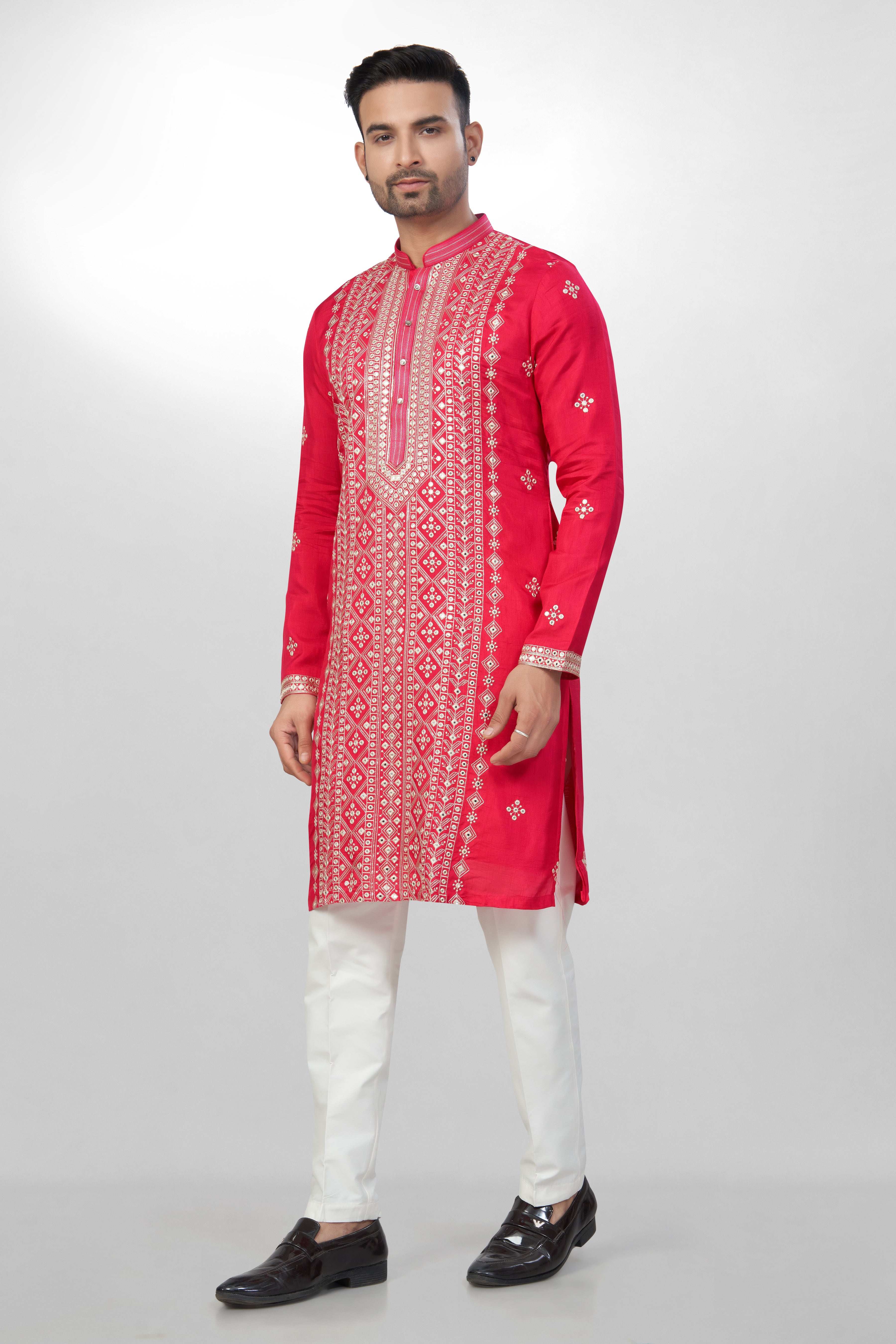 Lustrous Rani red Silk Kurta Set for men - Heavy Mirror & Thread Embroidery - M / Pink / Silk