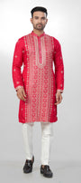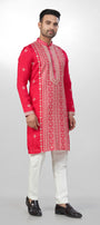 Step into the Spotlight with this Luxurious ad Vibrant piece designed for occasions like Weddings, Engagements or major festivals. This Kurta is a bold, festive Crimson or Rani Red. The fabric appears to be a Lustrous Silk, which gives it a slight sheen and rich texture perfect for evening or ceremonial wear. Kurta is covered in dense thread work Embroidery, primarily in a white or silver colour, intricate geometric and diamond- shaped motifs arranged vertically across the body of the kurta.