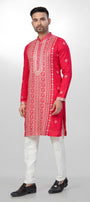 Lustrous Rani red Silk Kurta Set for men - Heavy Mirror & Thread Embroidery