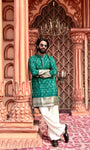 Tailored for the modern gentleman, this Peacock green mid-kurta is crafted from a breathable cotton-silk blend with a soft inner lining for lasting comfort. The subtle woven accents add refined character, making it effortlessly sophisticated without trying too hard.