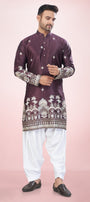 Step out in sophistication with this exquisite Mulberry Silk Blend Kurta, designed for the modern man with a taste for traditional elegance. The highlight is the detailed Silver and Beige Embroidery along the hemline and cuffs. The design features a stunning blend of architectural motifs, floral elements and traditional patterns, giving it an ethnic, heirloom- like quality.