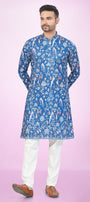 Step into the Spotlight with this Rama Blue coloured printed kurta. A stunning, modern and universally flattering pastel shade. Cotton blend with full cotton lining. Delicate Minimalist Bootis. The kurta is adorned with sparse, finely woven or embroidered motifs spread across the body. This texture and traditional charm without being overpowering.