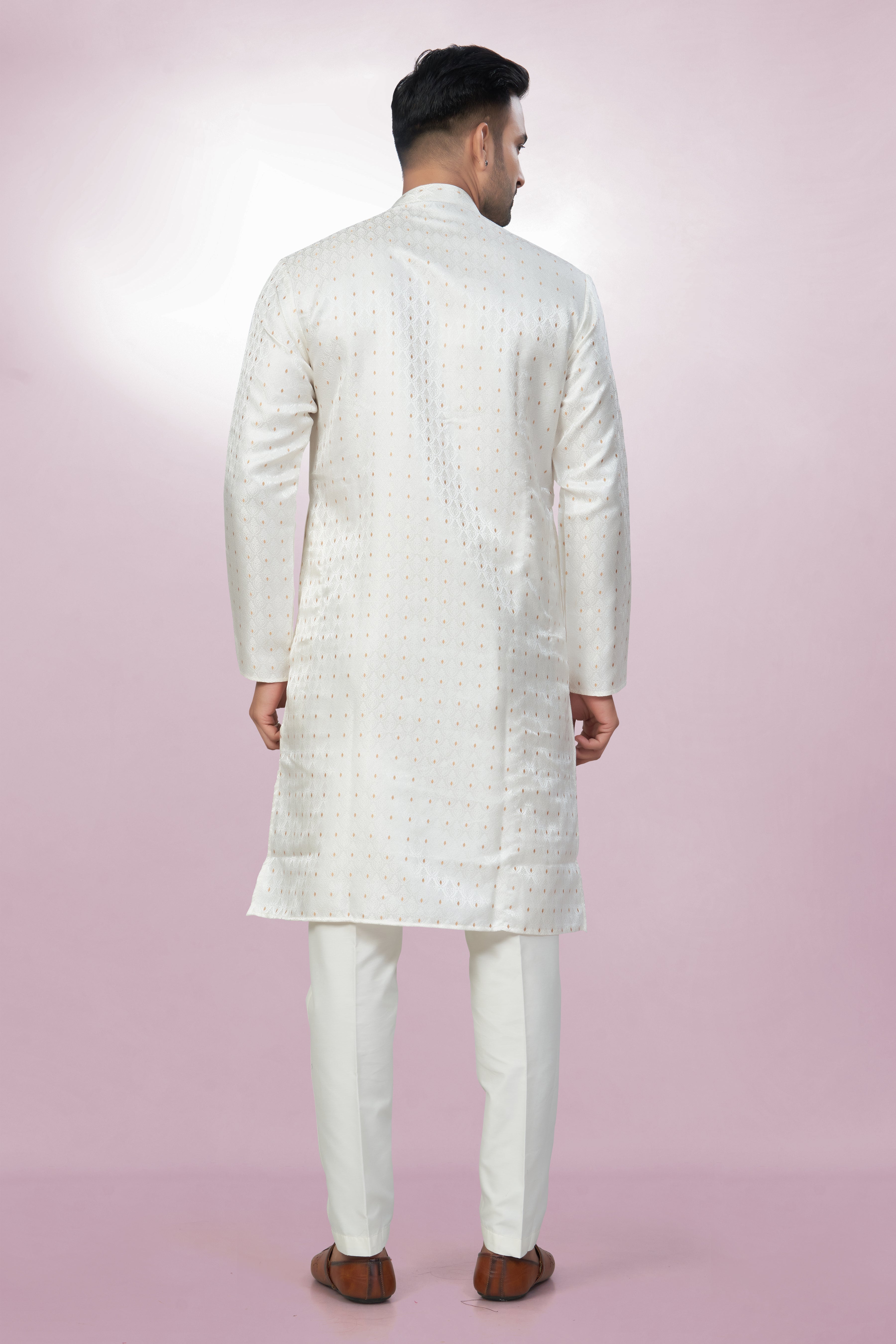 Step into the Spotlight with this wHITE Brocade/Silk Kurta, Intricate Self- Woven Pattern directly into the Cloth. These motifs are woven in a Complementary light gold or Musturd tone, Creating a beautiful contrast against the seep Voilet base.